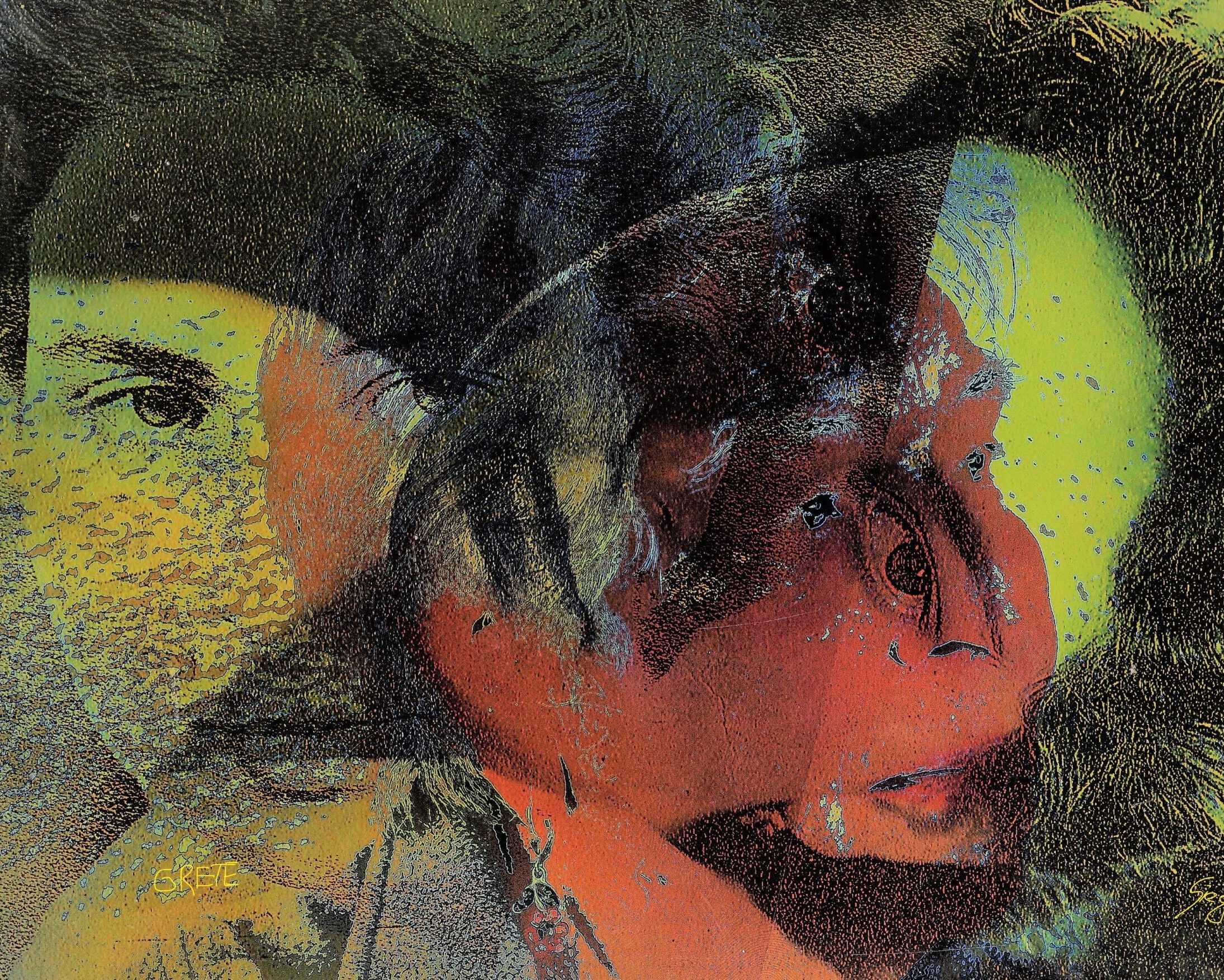 Vogelzeichnung von Albert Masser mit Feder- und Fellmotiven, Kunstwerk aus der Ausstellung "Zwischen.